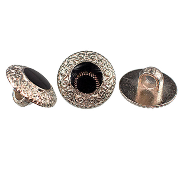 Descrição: Botão prateado com pé, com detalhe de pedra no centro usado para confecção de roupas.