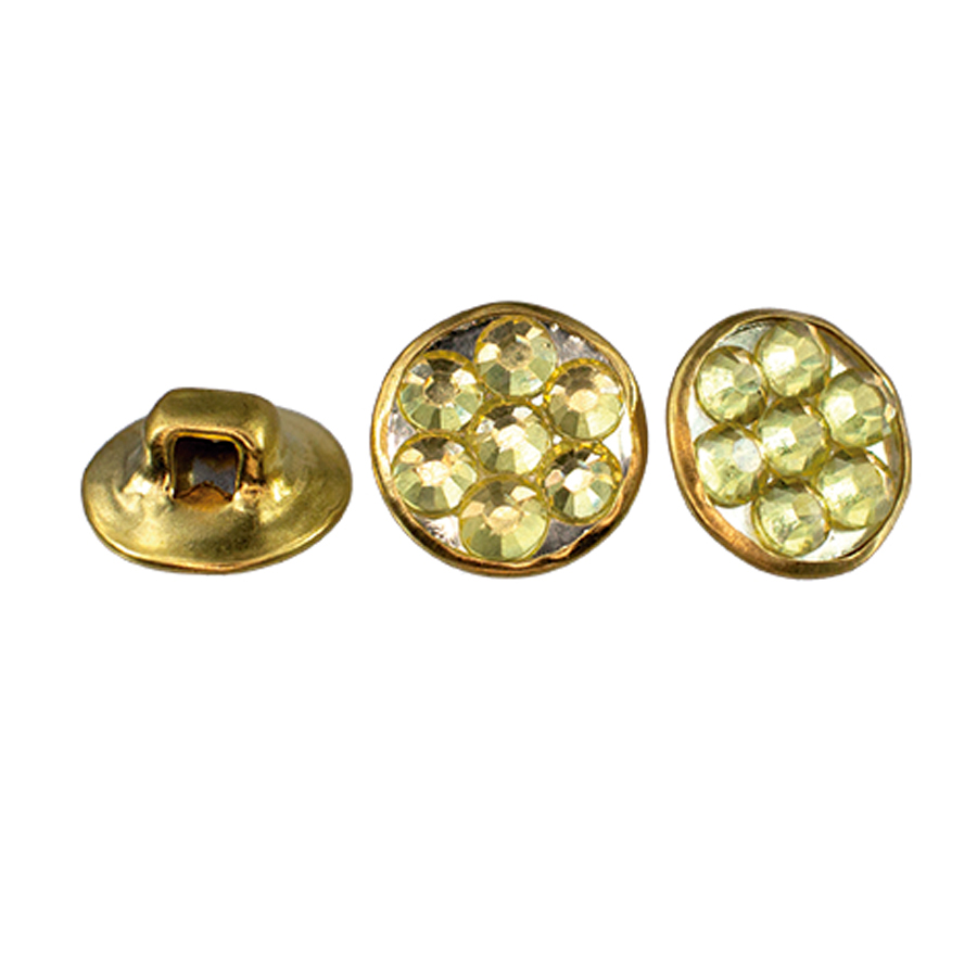 Descrição: Botão Dourado com pé com detalhe de pedra brilhante, usado para confecção de roupas, principalmente roupas de tecidos finos.