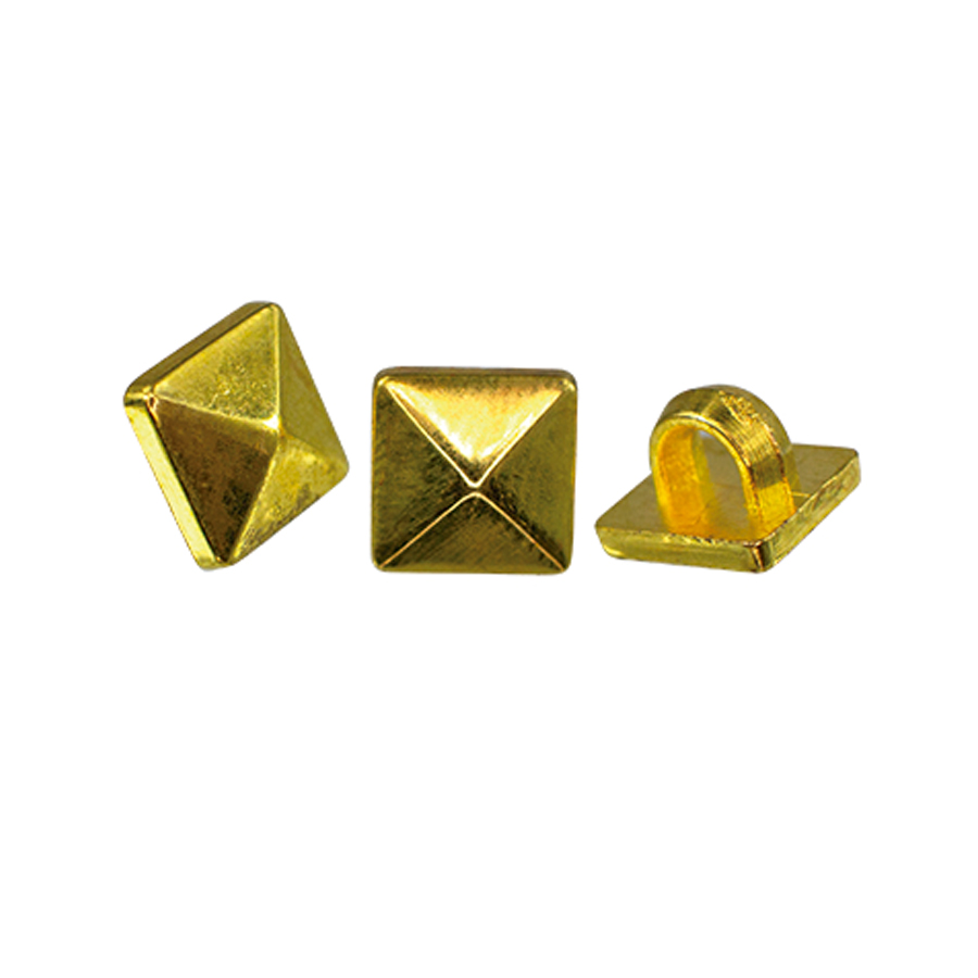 Descrição: Botão spike quadrado dourado com pé modelo de spike, usado para confecção de roupas.