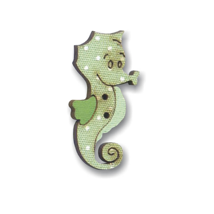 Botão madeira patchwork em forma de Cavalo marinho verde.