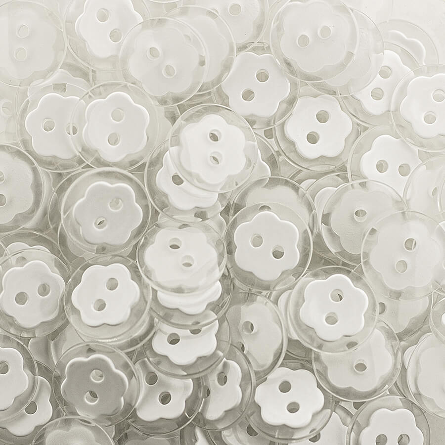 Botão transparente com base branca brilhante no centro em forma de margarida.