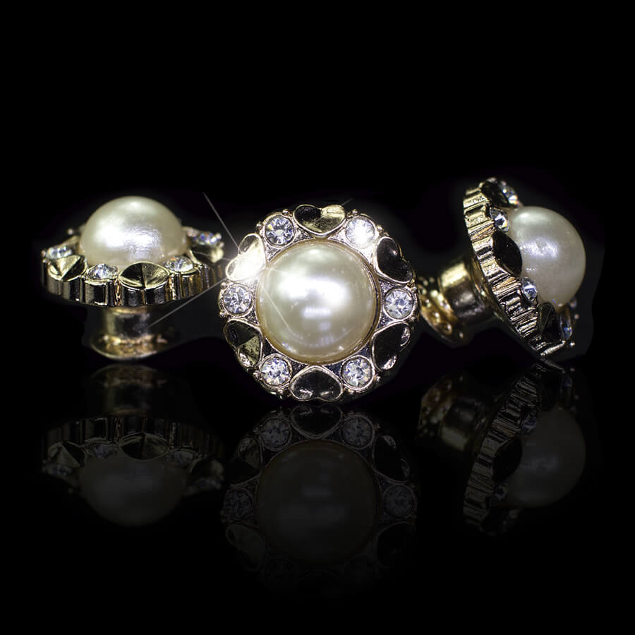 Botão Linha Zamac dourado com pérola artificial e pedras brancas.