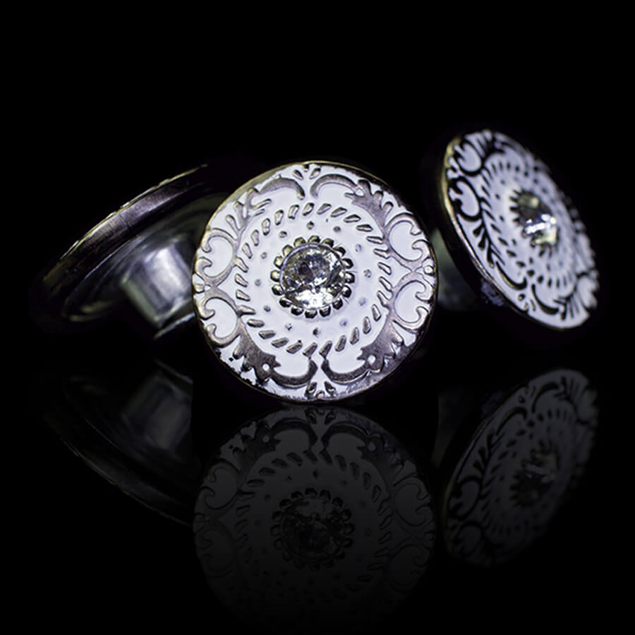 Botão Linha Metal Misto Flexível branco com detalhes prata.