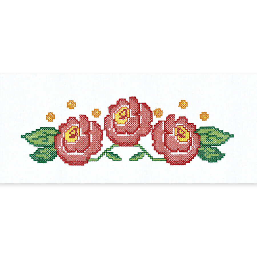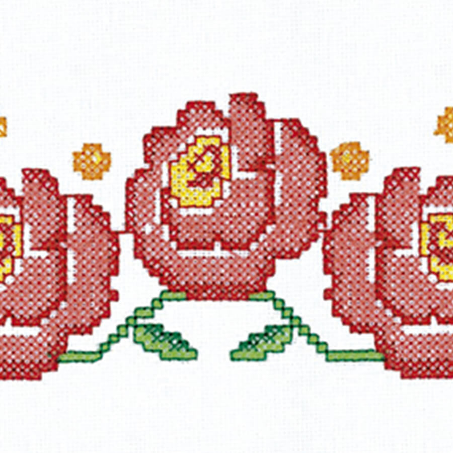 Faixa de tecido algodão bordada com ponto cruz usada para aplicação em pano de copa, toalhas, cama, mesa e banho em geral.