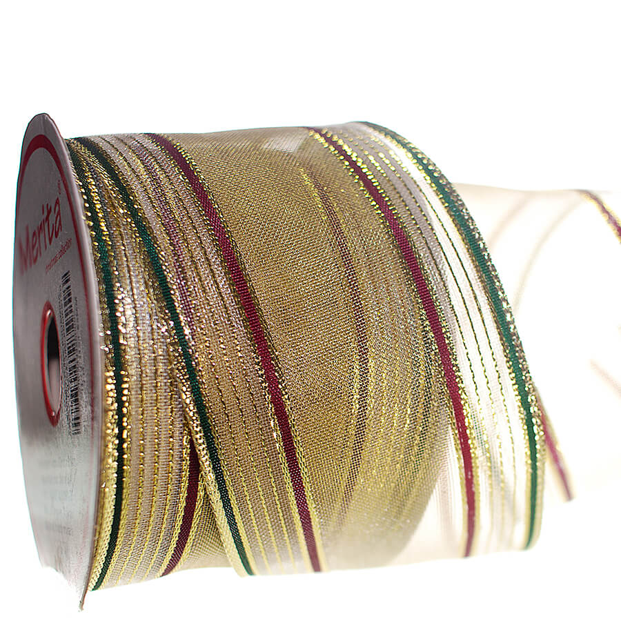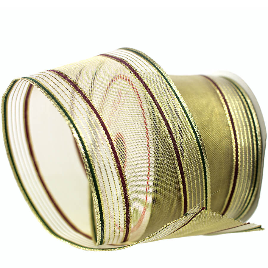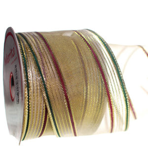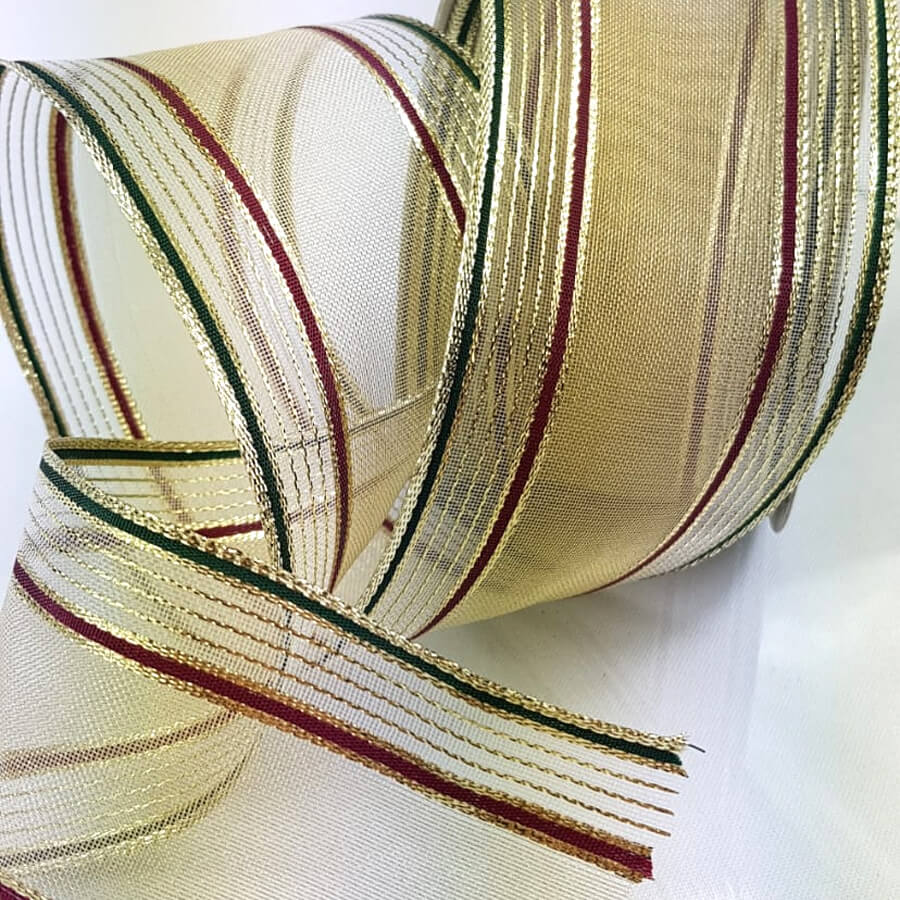Fita Aramada Dourada com listras laterais vermelha e verde, utilizada para acabamentos e artesanato em geral.