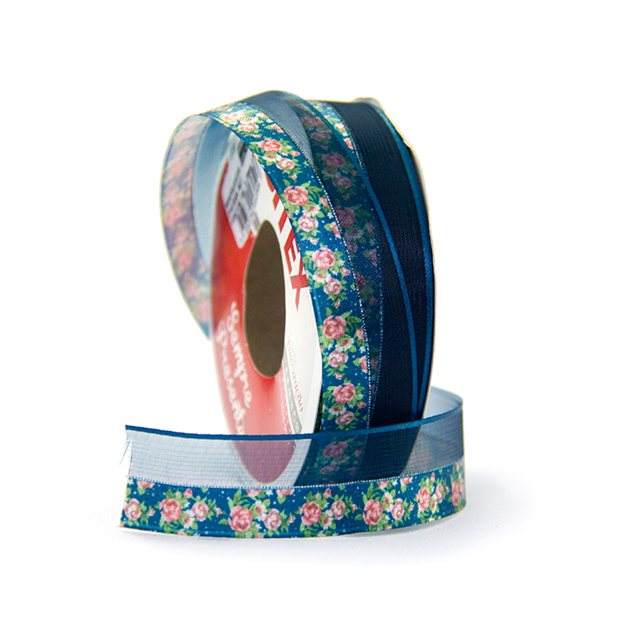 Descrição: Fita em Cetim Voal cor 119 com estampa floral azul marinho, disponivel em diversos tamanhos.