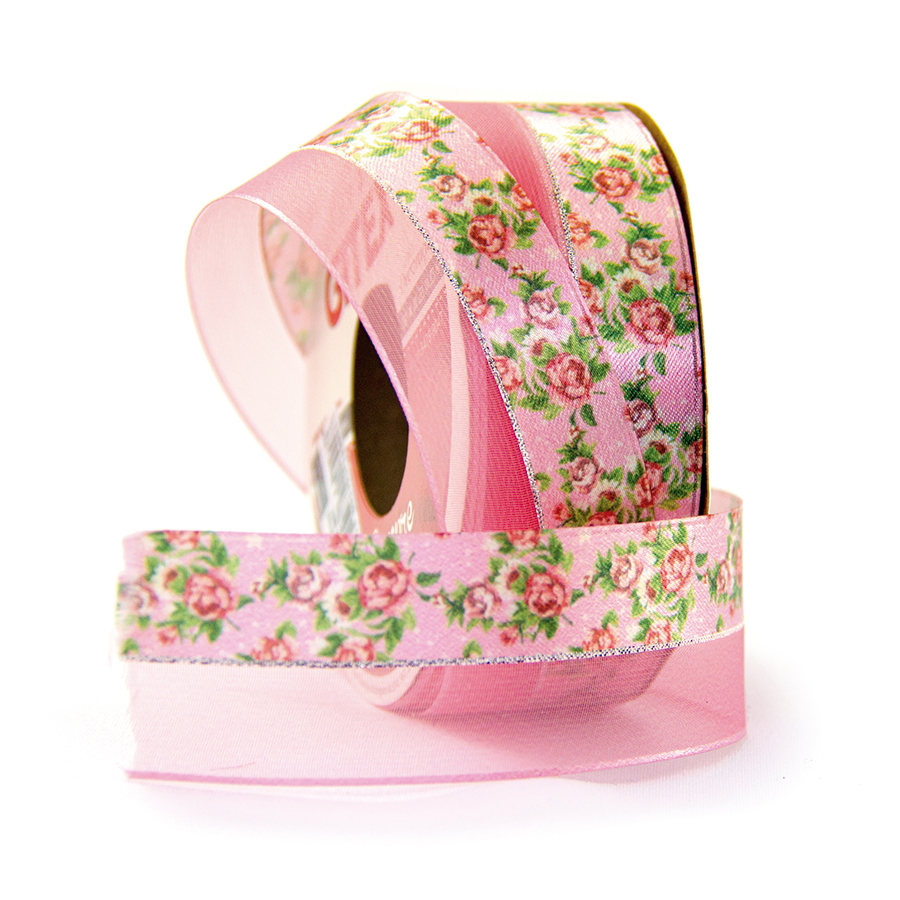 Descrição: Fita em Cetim Voal cor 183 com estampa floral rosa, disponivel em diversos tamanhos.