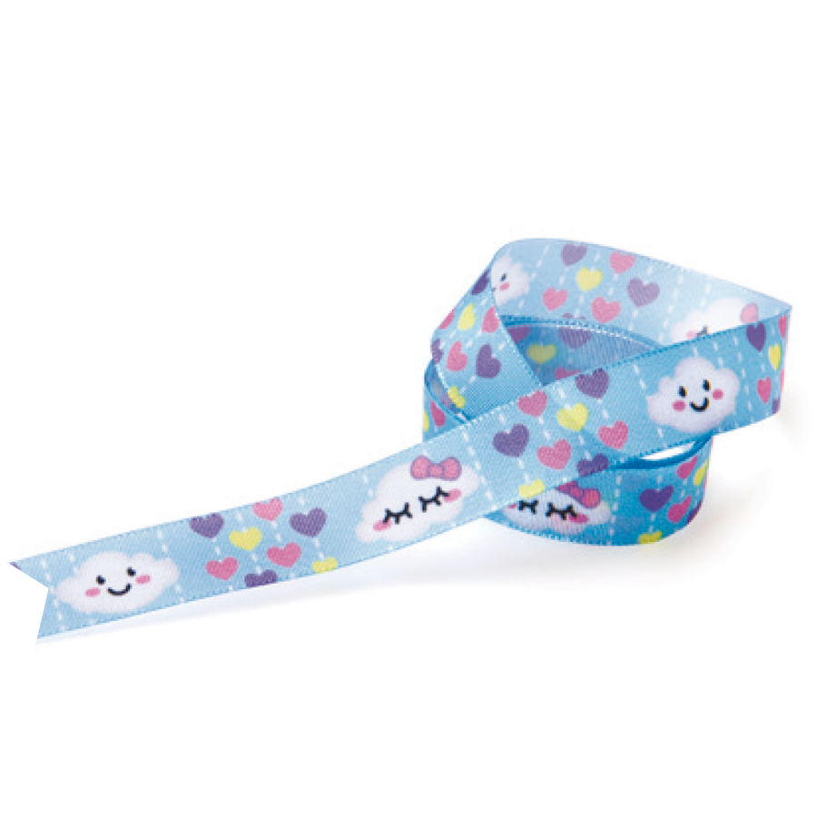 Descrição: Fita em Cetim azul com estampa de nuvens brancas e corações coloridas.