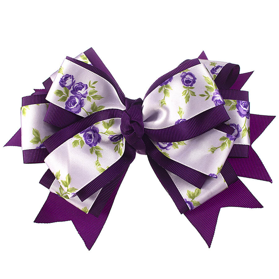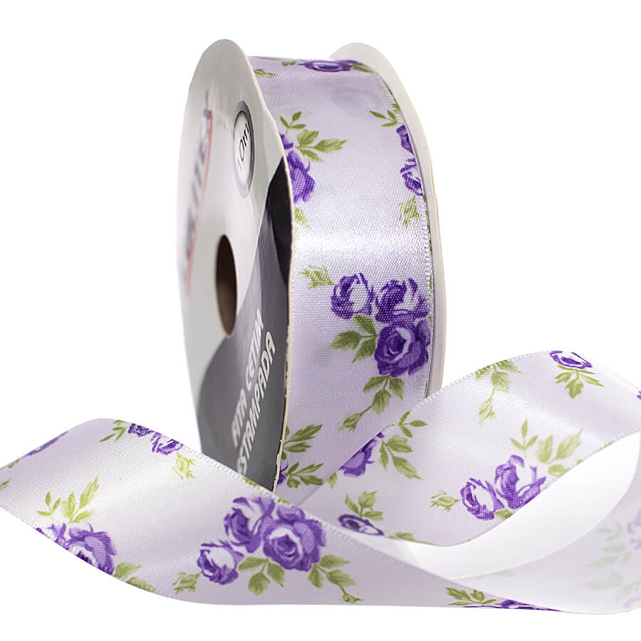 Fita de cetim lilás com estampa floral utilizada para confecção de laços, acabamentos, e artesanato em geral.