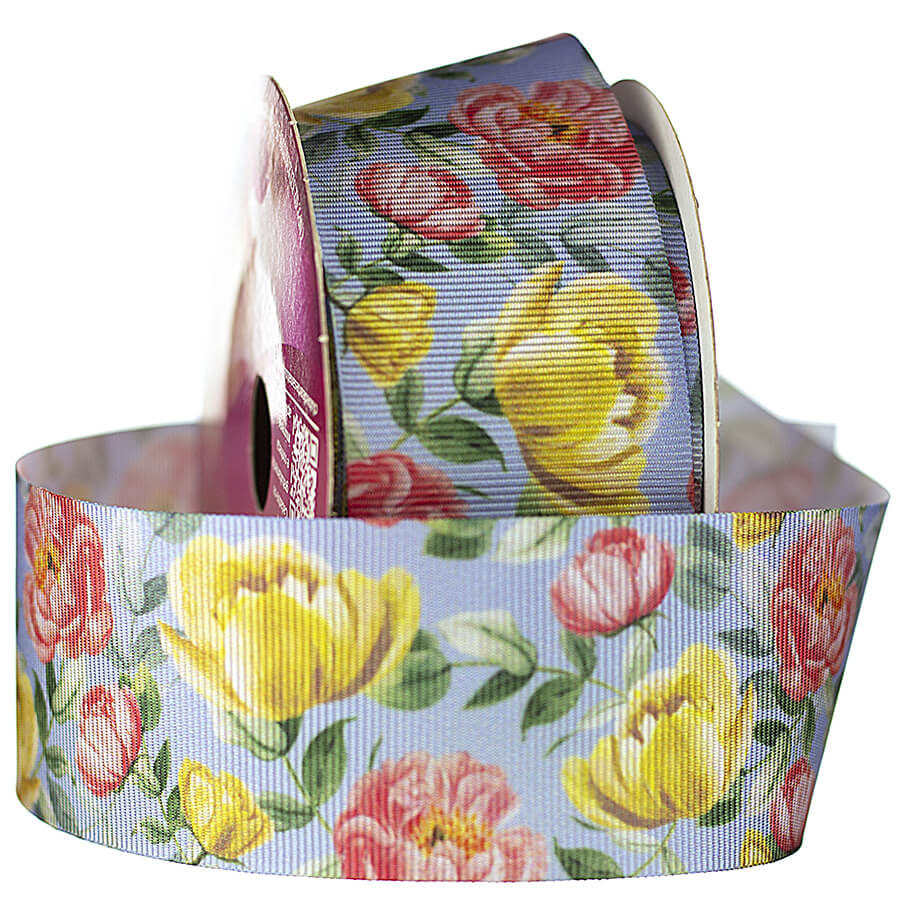 Descrição: Fita em gorgurão azul com estampa floral colorido.
