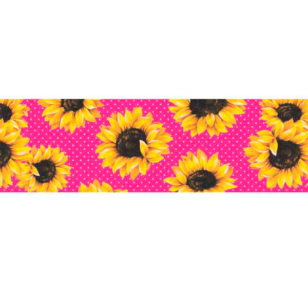 Descrição:Fita Gorgurão rosa com estampa de girassol amarelo.
