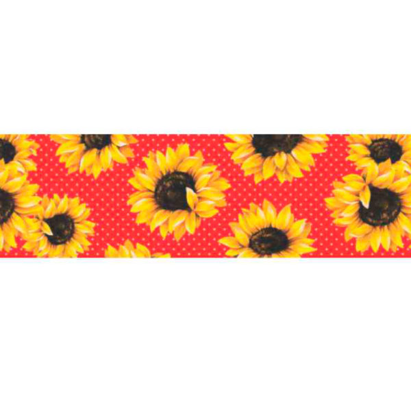 Descrição:Fita Gorgurão vermelho com estampa de girassol amarelo.