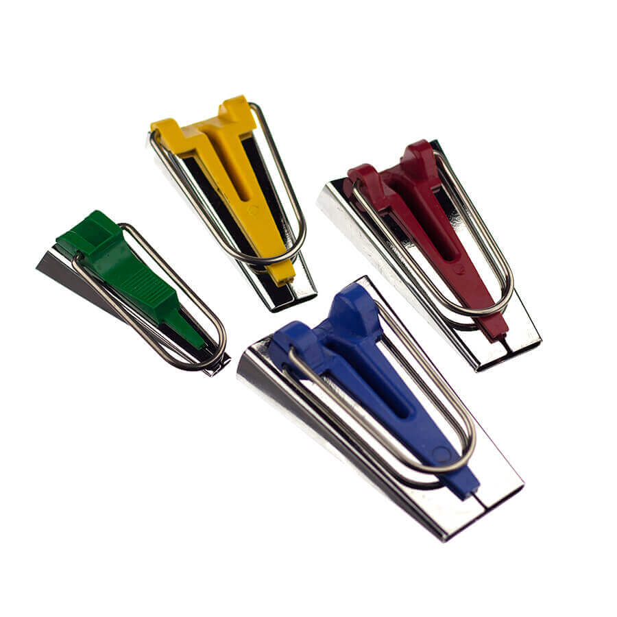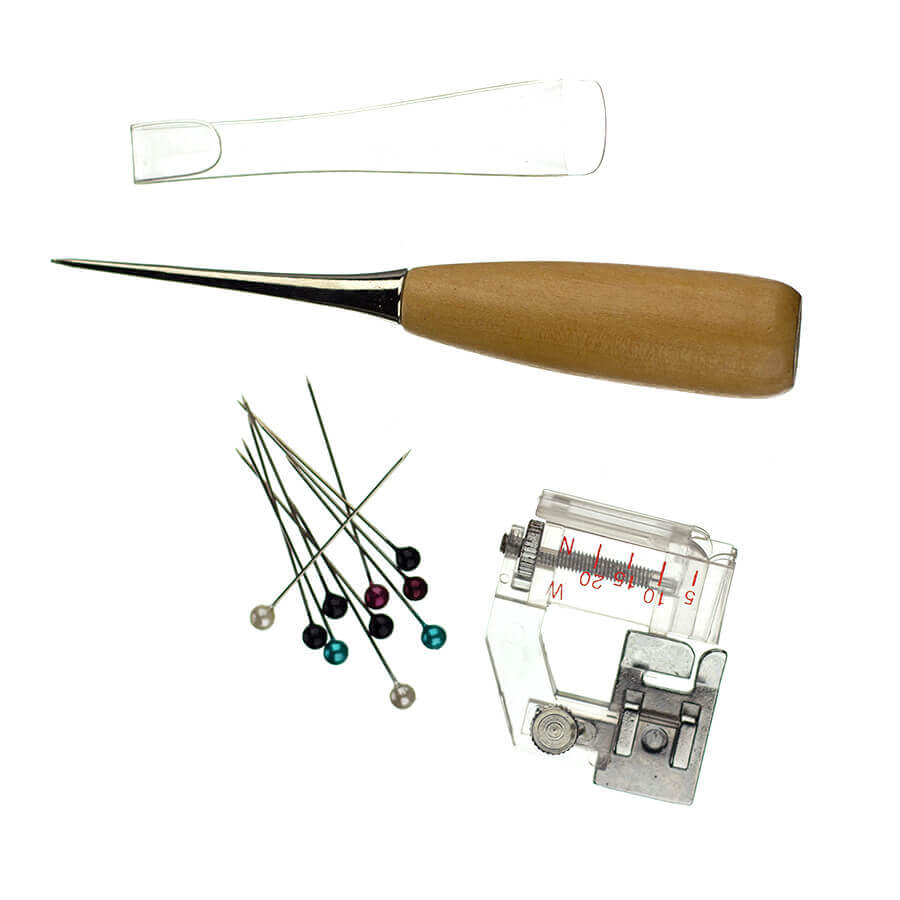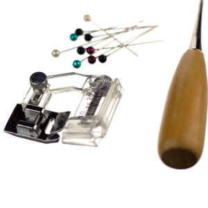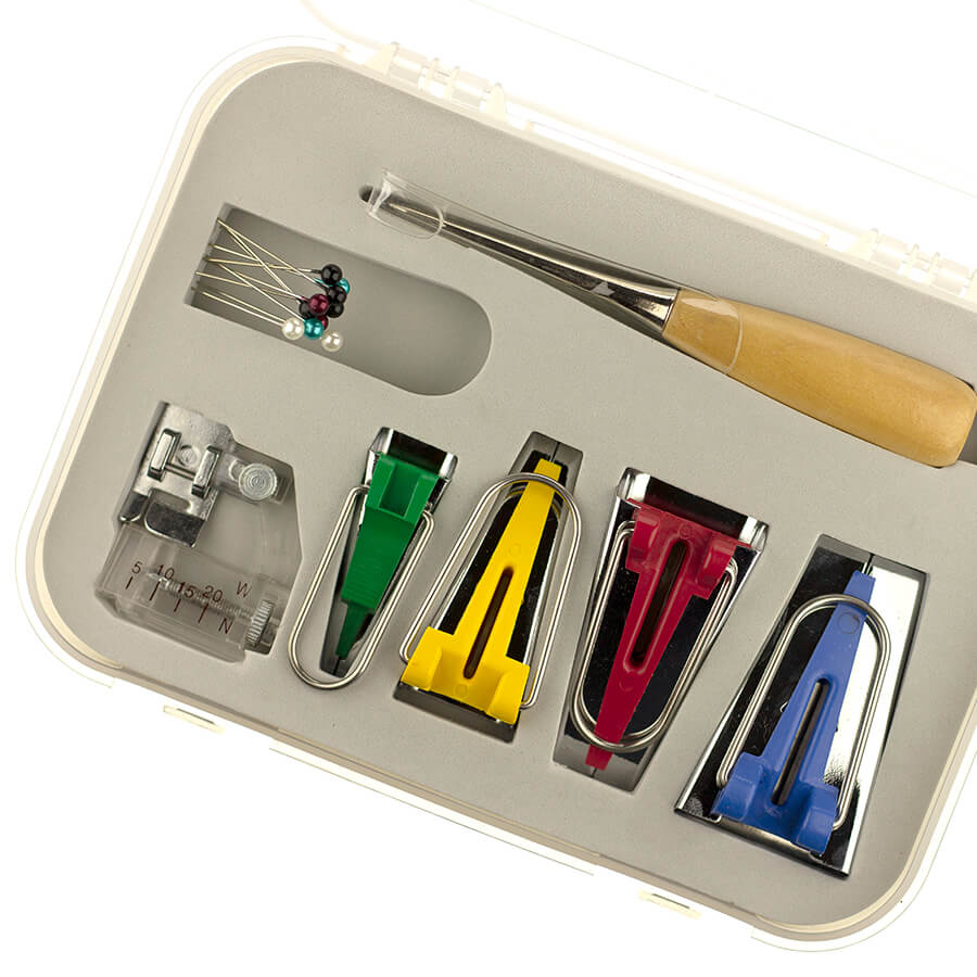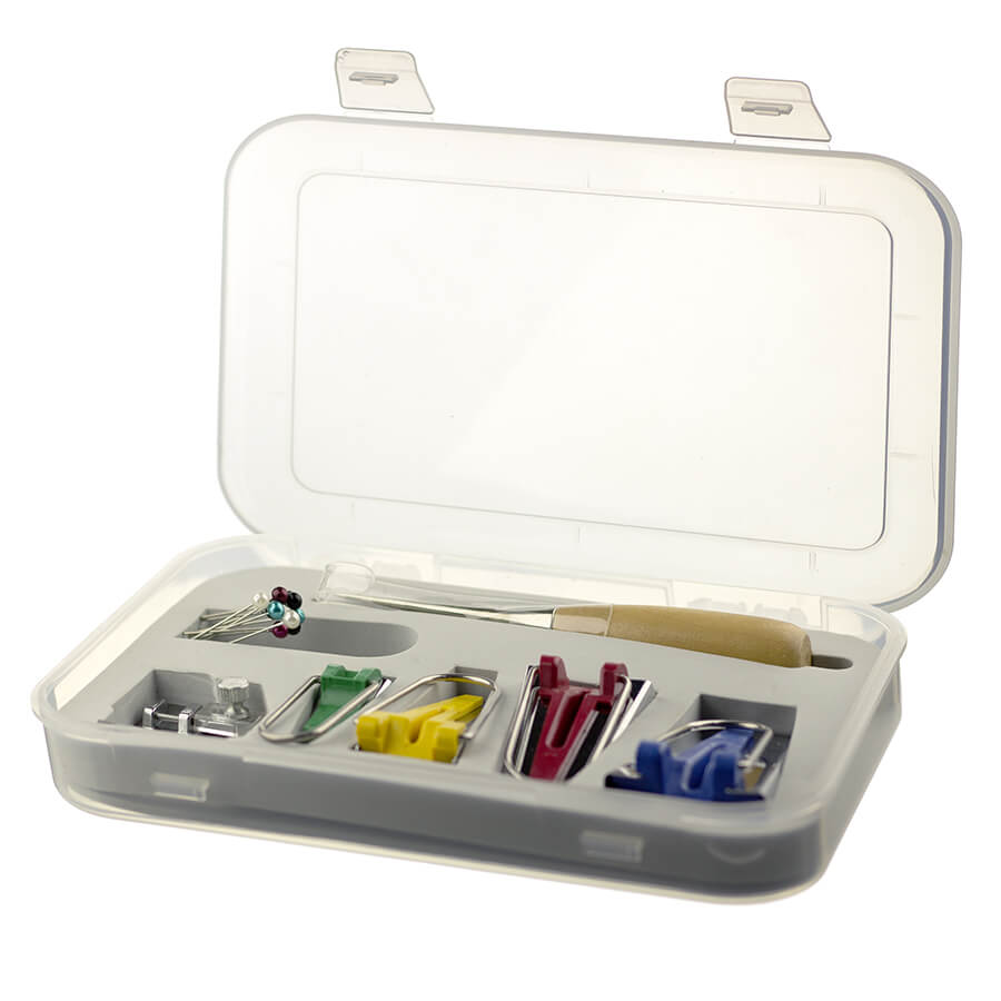 Descrição: Calçador de viés com regulagem, vazador, box c/ alfinetes, 4 aparelho de fazer viés 25mm,18mm,12mm 6mm.